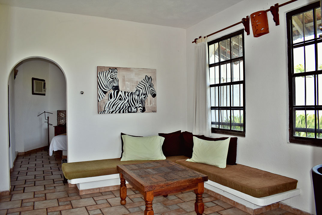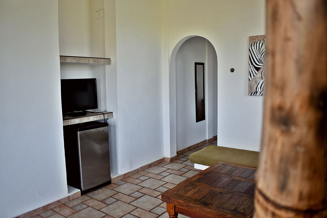 Habitación con 2 camas matrimoniales o 1 cama king size, baño, sala con T.V. y mesa exterior con vista al mar.